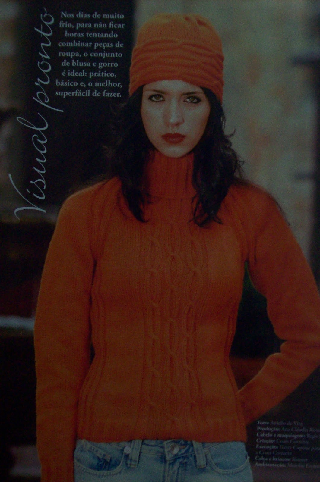 Blusa e gorro Ferrugem Tamanho: 36/38 Material:5 nov. de Cisne Premium( nov.de 100g.)na cor 3176(ferrugem);ag.para tricô Corrente nº 4 e nº 4,5;ag. Tapestry Corrente nº 18 para as costuras. Tensão do ponto: 10 x 10 cm = 16 p.x32 carr. (medidos sobre o p.m e as ag.º 4,5). Abreviaturas e pontos empregados: p.-ponto;ag.-agulha;m.-meia;t-tricô;carr.-carreira; rep.-repita;trab.-trabalhe; nov.- novelo; p.de barra 3/2- (lado direito do trabalho= 3t., 2m.lado avesso do trabalho= m. sobre m. e t.sobre t.); p.m.- ( direito em m., avesso em t.); motivo de trança- acompanhar o diagrama. Execução: Costas: na ag. nº 4, monte 88 p. e trab. 5cm no p.de barra 3/2. Mude para a ag. nº 4,5 e trab. do seguinte modo: ( lado direito do trabalho) 13 p. no p.de barra 3/2, 62 p. no p.m. e 13 p. no p. de barra 3/2. A 38 cm desde o início do trabalho arremate nos 2 lados para a formação do raglan 1 vez 5 p. e a 8 p. das bordas a cada 2 carr. 25 vezes 1 p., arremate os p. restantes de uma só vez. Frente:na ag. nº 4, monte 93 p. e trab. 5 cm no p. de barra 3/2. Mude para a ag. n º 4,5 e trab. do seguinte modo: ( lado direito do trabalho) 13p. no p.de barra 3/2, 17p. no p.m., 33 p. motivo de trança. 17 p.m e 13p.no.p.de barra 3/2.A 38cm desde o início, arremate para a formação do raglan igual às costas. A 10 cm desde o início do raglan, arremate os 9p. centrais para a formação na beirada do decote a cada 2 carr. 4 vezes 3p.. Trab. o outro lado igual, invertendo oa lados dos arremates. Mangas: na ag.nº4, monte 46p.e trab. 5 cm no p.de barra 3/2, mude para a ag. nº 4,5 e trab.no p.m., aumentando nos 2 lados a cada 8 carr. 6 vezes 1 p.. A 47 cm desde o início, arremate nos dois lados para a formação do raglan, igual às costas, arremate os p. restantes de uma só vez. Acabamento e montagem:una as laterais, feche as mangas e pregue-as ao redor das cavas raglan, deixando um lado da cava das costas sem costurar, para fazer a gola. Gola: com a ag. nº 4, levante 125 p. distribuídos uniformemente ao redor do decote e trab. no p.de barra 3/2, para o lado avesso do trabalho. A 20cm desde o início, arremate os p. de uma só vez. Una a cava até o final da gola com pequenos p. e vire metade da gola para o lado direito do trabalho.
